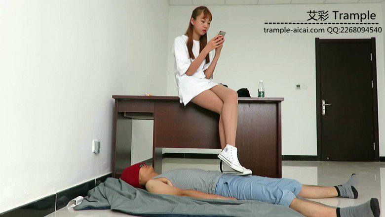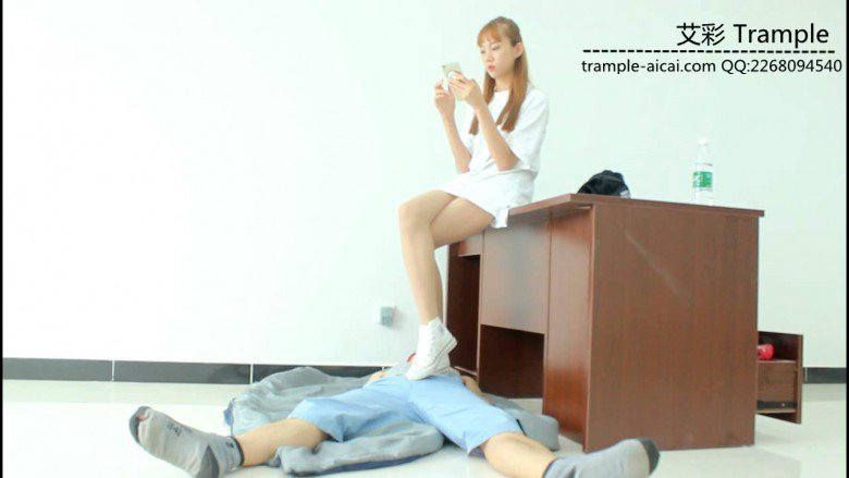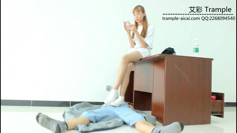 00后女主坐在桌子上,让贱狗跪下,给自己放脚,然后踢到贱狗,用白色帆布鞋各种踩踏贱狗下体,极具羞辱!