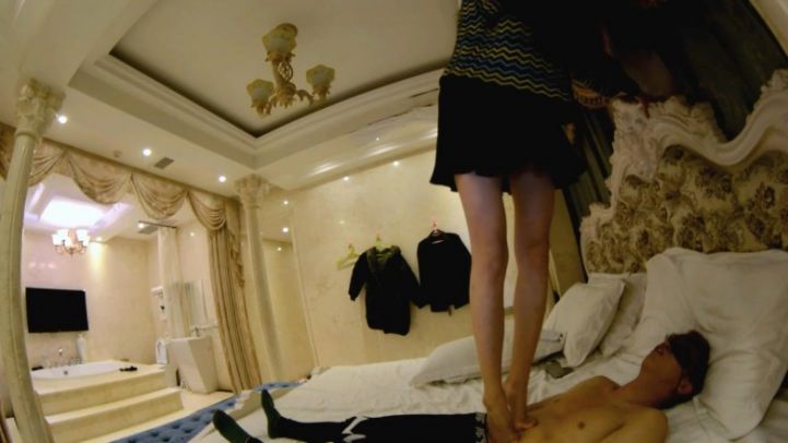 ④弟弟悄悄醒来闻脚,弄醒了姐姐。姐姐生气地用脚踢他、踩他