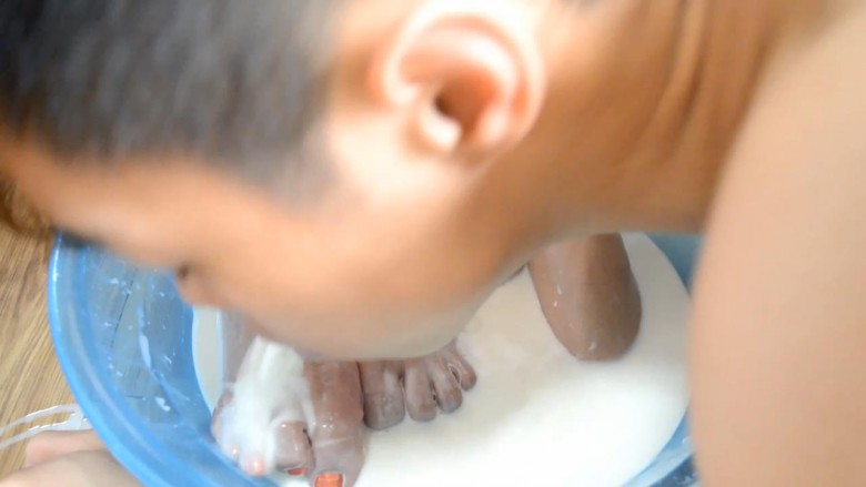 牛奶倒到盆里,指挥舔脚
