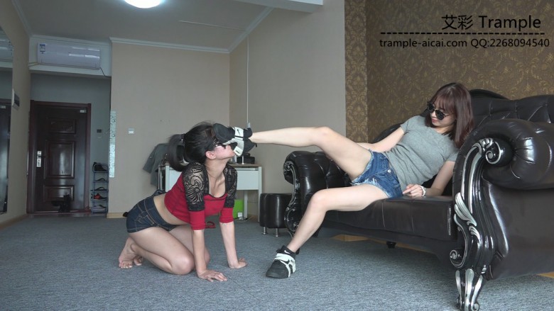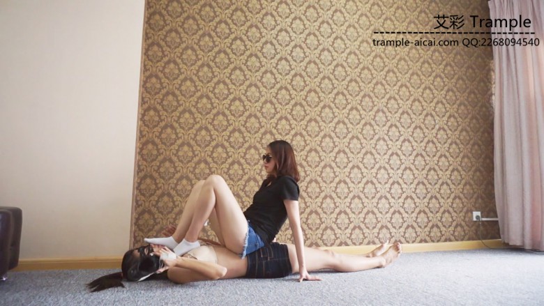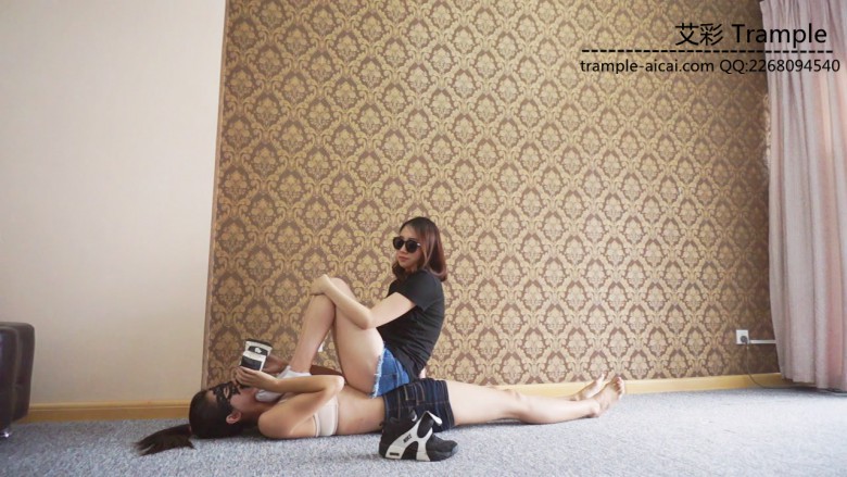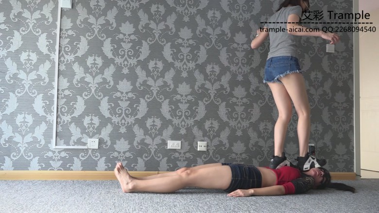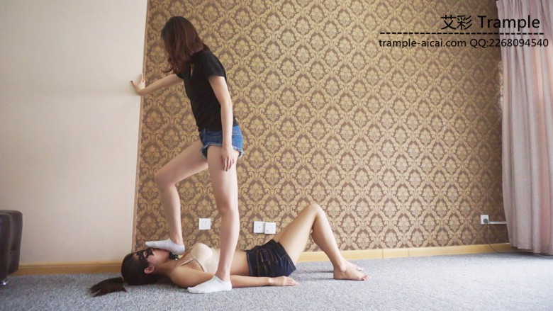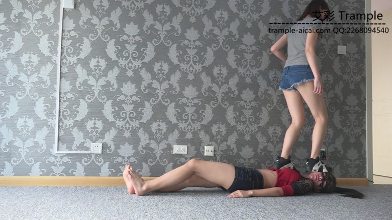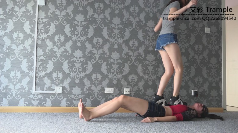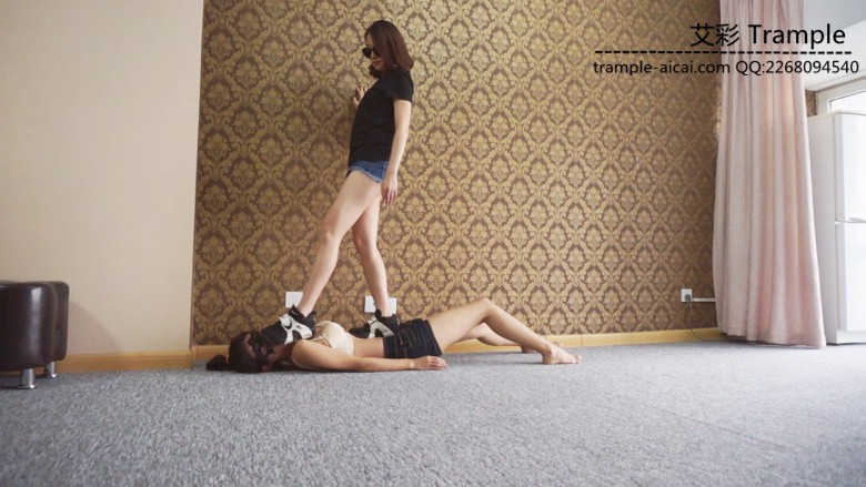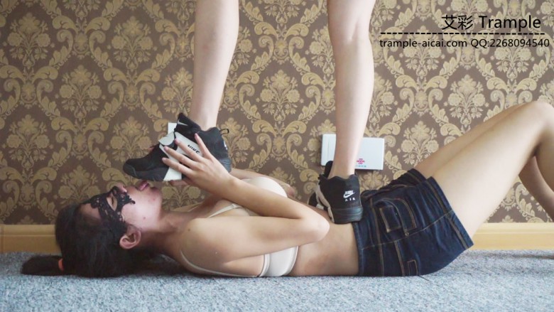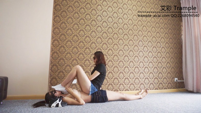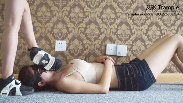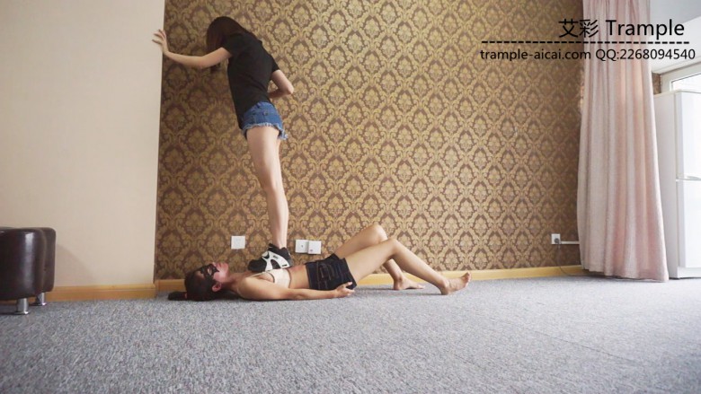 白棉袜黑色运动鞋全体重践踏,全体重踩胸部,脸,头,肚子,裆部,姿势优美,女王气质。之后让女M舔运动鞋边缘