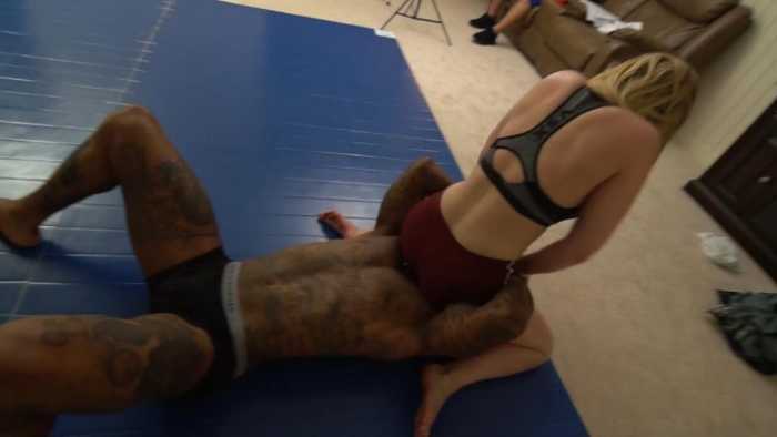 装B黑人肌肉男,全身纹龙绣凤感觉自己很牛x。结果动起手来却被白人小软妹Tilly一顿揍,绞杀勒脖子失去战斗力后再一屁股坐在狗脸上窒息羞辱,最后贱狗窒息被KO,Telly霸气地一脚把他的狗脸踩在脚下,高傲地摆出了胜利者的Pose!