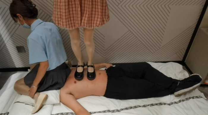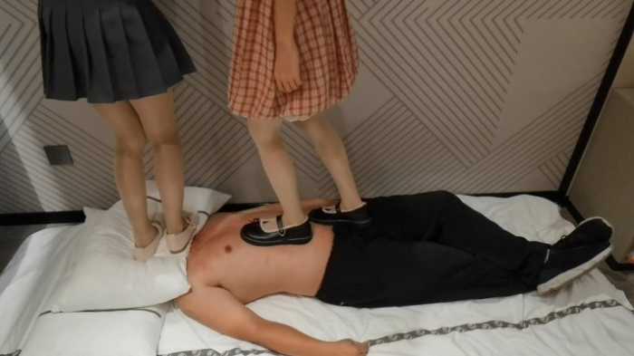 因为是用枕头挡住了,看不到脸,用脚踩的时候只能感觉到头在地下,不知道具体在踩哪,毯子说这种不知道落脚点的踩法,感觉头要爆炸了,跟无意识就差了一个看不到,新来的女大(粉色裙子),坐的时候也是相当不含糊,历史上第一个吧毯子干到要窒息的,后面他已经承受不住直接放弃了,枕头都拿走了,他说以前还行,但是这次是一点呼吸都进行不了,就感觉一大团肉直接堵住了呼吸口。而且与此同时,另一个踩在身上的下脚也不含糊,而且在地上,疼痛感直接上升一个level。