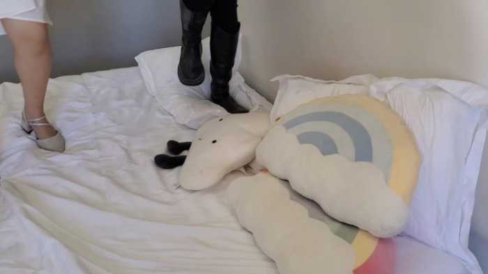 A259 – 俩妹子脏皮鞋和单鞋踩床和被子 JS251130~5