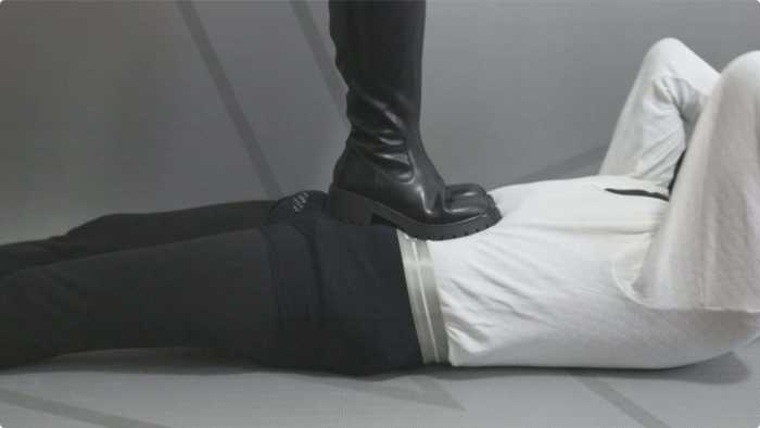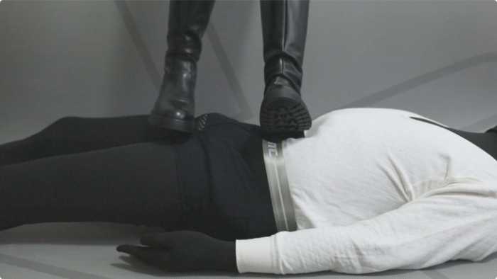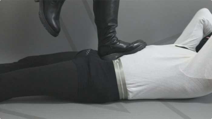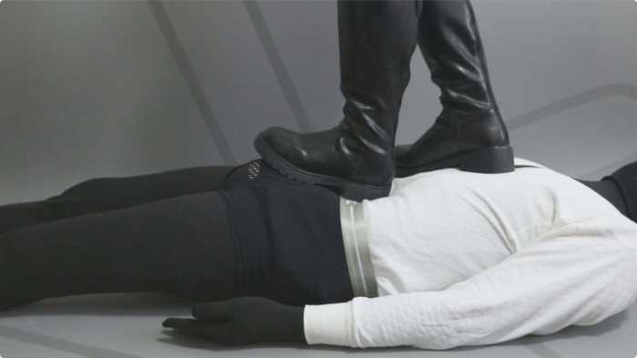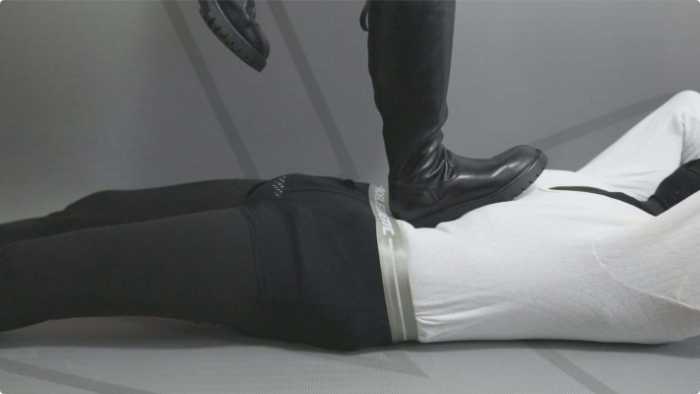 大皮靴子踩着包皮男肚子,让他做仰卧起坐。