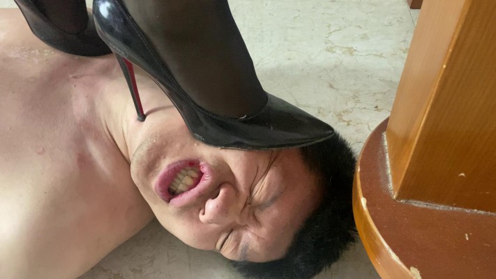 感谢tk**1的建议与等待,这次就来一次最残忍最极致的高跟鞋全体重踩脸,当然,也感谢其他同好的意见和支持,想看全体重踩脸的同好还是非常多的。还是经典的黑丝配黑高跟鞋吧。全体重踩脸需要毯子奴性极强,忍受力极强才可以。先狠狠的踩乳头,让毯子只能痛苦的抬头看着,却一动不能动的忍受着,慢慢的唤醒毯子最贱的奴性,然后用毯子的脸把鞋底擦拭干净,以毯子的胸部为平台,先踩到毯子的胸上,再全体重踩到毯子的头上,踩头确实和踩身体感觉大为不同,圆圆的很滑,想跺又跺不开,想叫又叫不出来,只能发出呜呜声,真是好惨啊!侧面踩头还不过瘾,再来一个高跟鞋全体重踩正脸,毯子的脸又扭曲了,被高跟鞋踩出了皱纹,嘴唇也踩破了。在毯子的胸上留下了一个又一个性感的鞋印,在奄奄一息的毯子绝望的眼神中尽情的嘲笑!