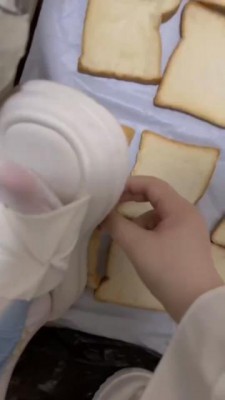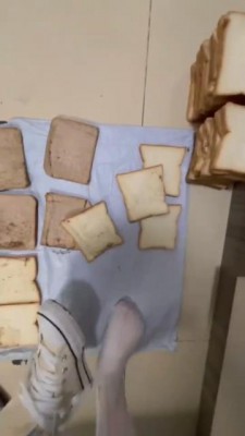 又是超可爱的桃子姐姐呀,今天要给狗狗制作狗粮了,只是几片面包狗狗肯定吃不饱吧?姐姐会用每一双鞋子加工食物哦,一共十几二十双鞋子吧?每一片面包都会印上狗狗喜欢的鞋印哦。贱狗还觉得不够?那让姐姐为你加点泥土,狗狗可要好好的都吃掉哦!