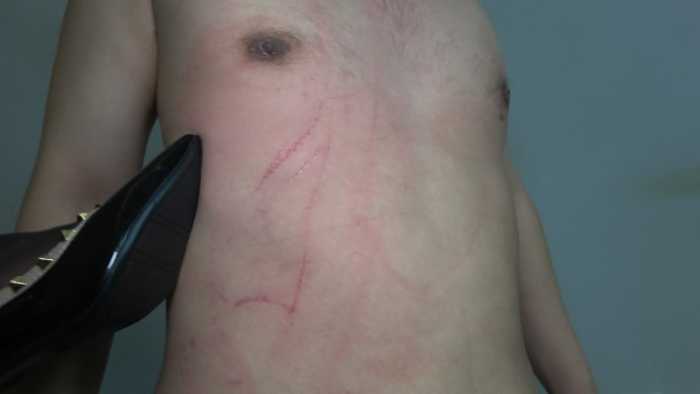 高跟踩踏乳头,踩肚子,踹头,铆钉鞋划踹出血痕。