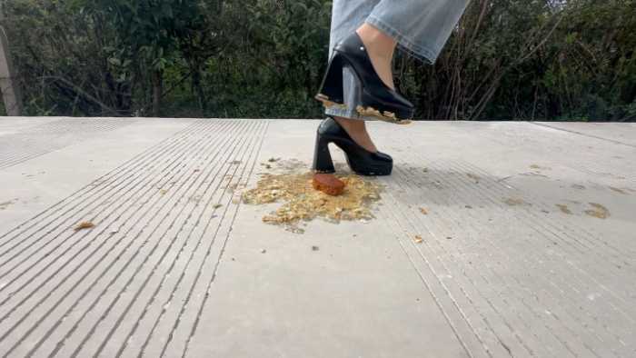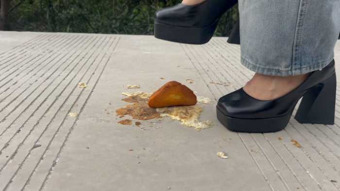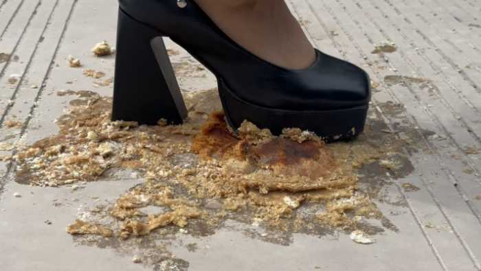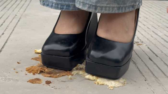 复古超高跟10cm玛丽珍鞋在户外踩了6个蛋糕,每一个蛋糕都对应不同的踩踏脚法,温柔的,无意识的,凶狠剁踩的,等等都有,特写与中远景切换拍摄;
