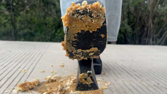 踩踏以后奶油与黏糊糊的枣泥粘在了鞋底上,主人抬起鞋底,给镜头前的狗狗们留了充足的盯S时间哦~