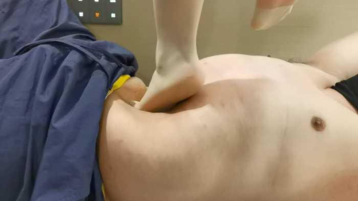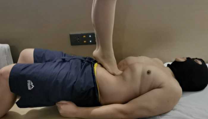 这次拉开了距离,可以看到明显的肚子悬空,肚子是深深陷进去的,后面有一个毯子更是被踩到凹下去,全是肚子在承受小翠的重量,毯子说感觉整个肠子都把小翠的脚给包住了,痛觉和舒适感直冲天灵感,而且在不穿鞋的情况下,毯子第一次被踩到肚子发紫。就已经悬空了,小翠还是不安分,还是要跳